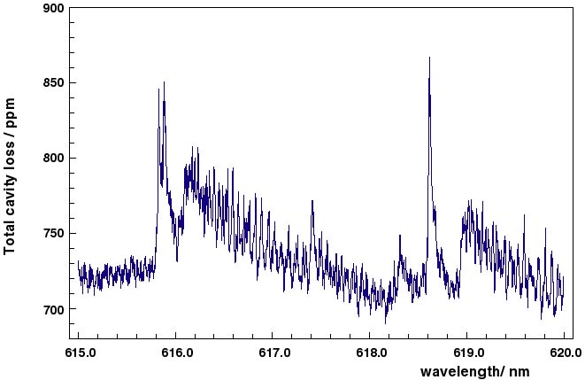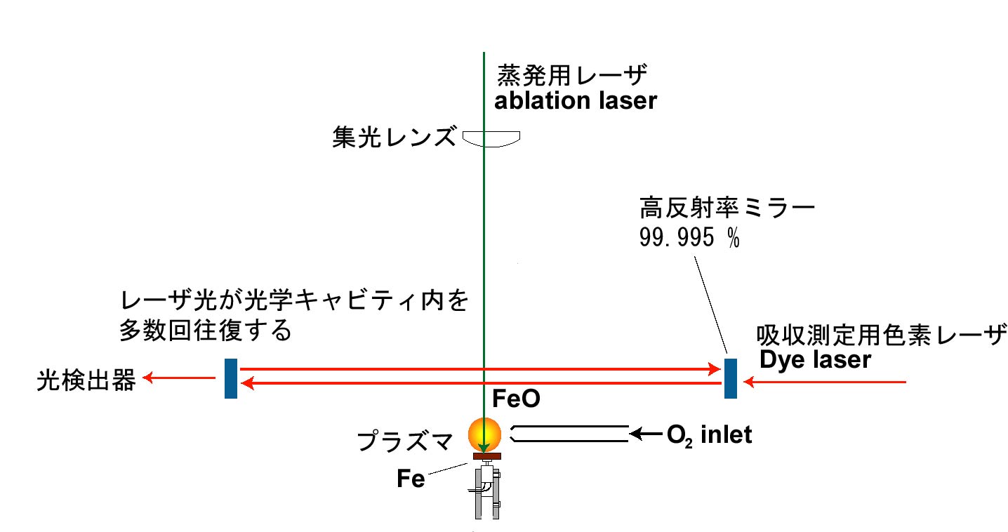生成した FeO ラジカルの反応性を調べるには、ラジカルの量を定量する必要が あります。FeO ラジカルはラジカルに特有な波長の光を吸収するので、その波長 のレーザー光をラジカルに吸収させ光強度の変化を測定することでラジカルを定 量できます。ラジカルは少量しか生成しないので、吸収量もわずかです。そのた め通常の吸収分光法ではなく、高感度吸収分光法であるキャビティリングダウン 分光法を用います。この方法では、レーザー光を2枚の鏡の間を往復させ吸収量を 増大させて高感度を得ています。