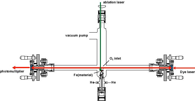 金属の表面にレーザー光を集光すると、瞬間的に高温になり金属原子が蒸発して 飛び出してきます。この現象をレーザー蒸発といいます。レーザー蒸発を用いる とどのような金属でも蒸発させることができます。私達の研究室では真空中で レーザー蒸発を行うことにより、Fe, Cr,Ti などの金属原子を生成しています。 また、レーザー蒸発がおきている部分に酸素ガスを供給すると酸素原子が1個 結合した FeO, TiO などのラジカルをつくることができます。下の図は Fe 金属にレーザーを集光し、FeO ラジカルを生成させる装置を示しています。