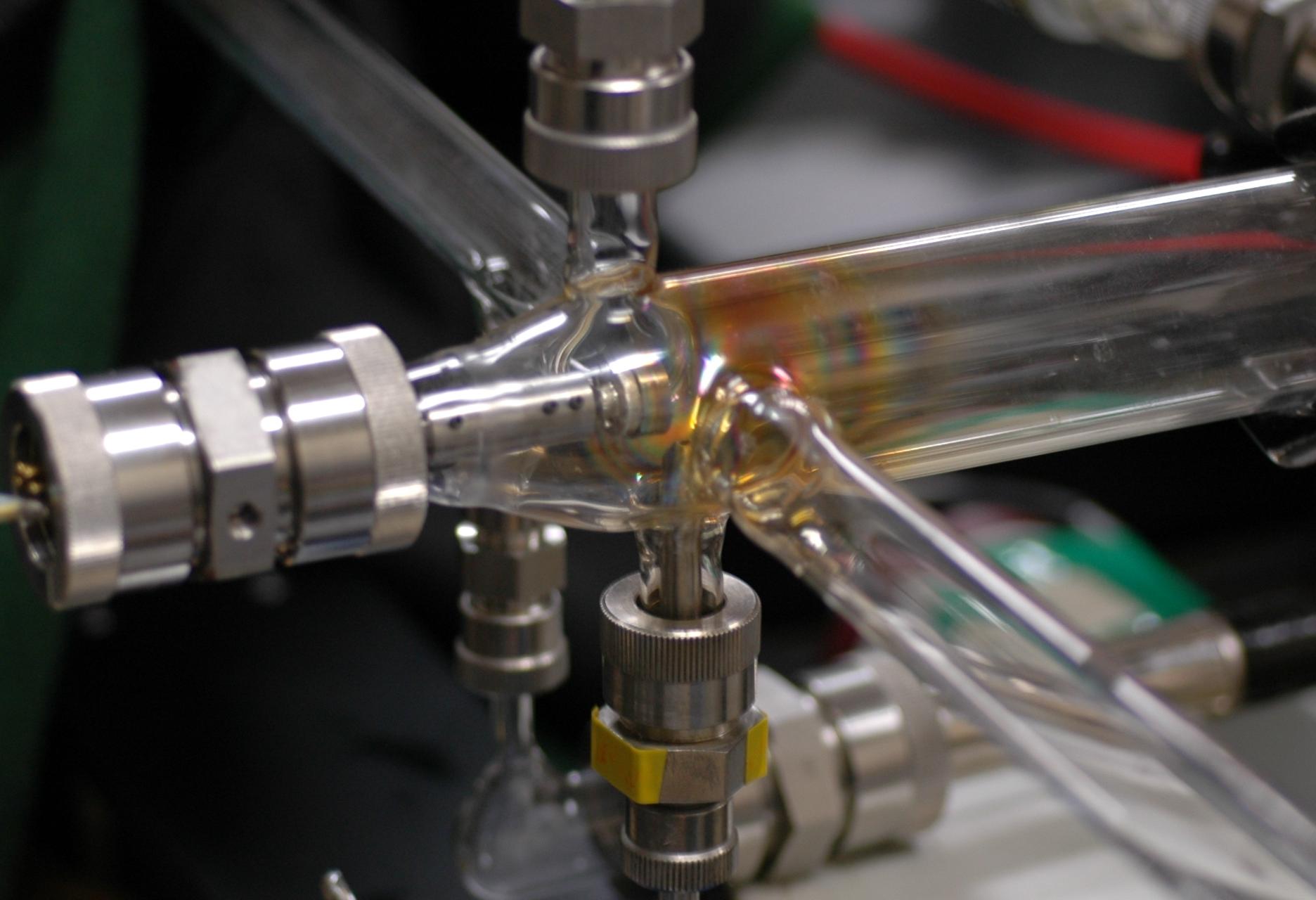 Fe 原子に酸素原子を結合させることにより反応性が増大することが実験的に確 認されましたが、このような現象がほかの遷移金属原子でも起こるのかはまだ確 認されていません。私達の研究室では、3d 遷移金属原子に酸素や水素などの簡 単な原子を結合させ、反応性がどのように変化するかを系統的に研究することを 目的とし、実験装置の整備、測定を行っています。