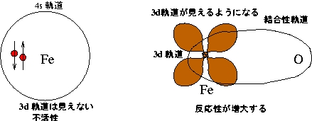 遷移金属原子に酸素原子を結合させたらどうなるでしょうか? たとえば Fe 原 子を例にとって考えてみます。Fe 原子とO 原子を結合させ FeO ラジカルを生成 させたとき、Fe 原子の4s軌道に入っている電子と酸素原子の 2p 軌道に入っている電子が共有結合をつくります。そのため Fe 原子の4s軌道に2個の電子が入っている(閉殻構造)状況はなくなることになります。 このような状況では外側から3d軌道が見えるようになり、 不活性ではなくなることが予想されます。実際に実験してみると 簡単な分子と反応することが報告されました。