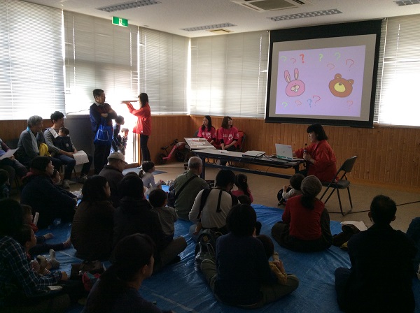 日本女子大学の学生が考えた「動く電子絵本」の読み聞かせをしています。