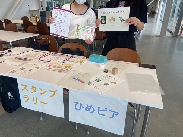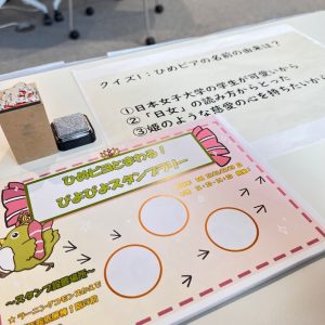 今年は、百二十年館B階ラーニングコモンズかえで、百年館低層棟1階EV前、杏彩館1階の3箇所にひめピヨのスタンプを設置し、参加者の方には各設置場所でひめピアに関するクイズに答えていただき、スタンプを集めてもらいました🐥