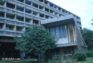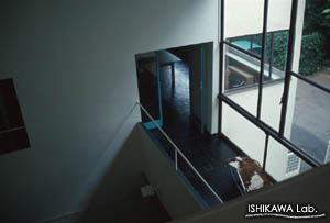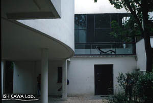 鉄筋コンクリートのピロティの上部に、箱を載せたたような構成になっている。
