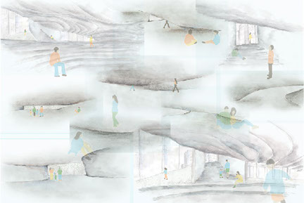 子どもの積極的に想像でものを見る力が、大人になるとなぜ失われるのだろうかという疑問を出発点に、メルロ=ポンティの<原初的操作>の考えから、大人と子どもを比較考察した。子どもは対象を理解できないまま何度も<原初的操作>を繰り返すが、大人は瞬時に対象を認識すると同時に心像が固定されるように、対象物を認識するに至るまでに<原初的操作>が繰り返される⻑さの違いがあることが分かった。修士制作では、この感覚を建築体験に展開させる。心像と対象の結びつきにくさ、場所のイマージュの身体への刷り込まれやすさが同時存在していることが必要であるとし、建築の空間体験を2 軸4 象限で分類し、建築構成とその組み合わせを分析する。比較分析を通じて、<原初的操作>を引き起こす建築構成を整理し、その気づきを応用してモデル化を行い、公開空地に広場を設計する。提案した建築によって、主体がその建築やその場にいる人、外部環境といった対象に対して柔軟に関係を構築し続け、身体を通じて心像が変化し続けている居場所が生まれることを目指す。