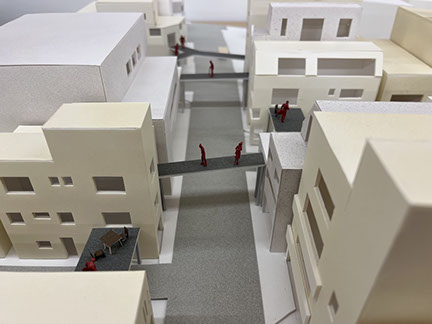 都市空間において、街路は最もドラマチックな生活の舞台である。人々が目的を持たずに歩くとき、街路には思いがけない発見や驚きが溢れ、歩行者に喜びや新たな視点をもたらす。しかし、現代都市では建物が提供する視覚的な情報が乏しく、歩行者は明確な目的地に向かって直線的に進むことが常態化しているため、街路本来の豊かさが十分に発揮されていない。目的地が都市空間を埋め尽くし、街路はその「隙間」として、わずかな移動時間を過ごすためだけの場になりつつある。人々の行動が予測可能な目的地で構成された都市において、単なる移動手段として消費される道に再び偶然の発見や豊かな体験をもたらすための都市空間の再構築をする。