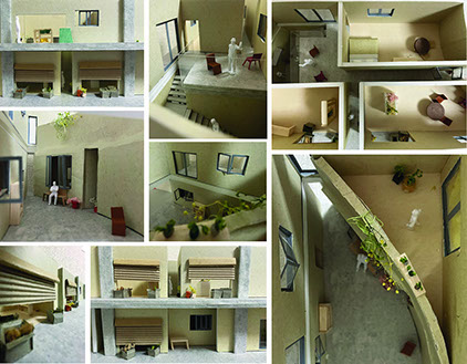 北側片廊下の都営アパートについて、高度経済成⻑期に建てられた建物の遺構として構造のラーメンの柱はそのままに、新たに内部空間の壁や壁に付随する開口の変化によりオモテとウラの性格を持った空間を設計した。また、現在バスの営業所・車庫として使われる一階部分は、リノベーションによりアパートに入っているテナントや住⺠の物々交換などの交流が生まれ、モビリティの流動性を活かした広場として地域のイベント開放スペースなどに使われることを期待する。