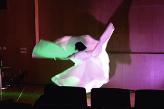 私たちは限られた設備の中、観客自らが踊り手の衣装に照明を当てることによって、鑑賞者であると同時に光源自体となり、踊り手は鑑賞される人によって光を照射されるという、見る見られる両者の互換性を意識化させることを考えました。それは、フラーが踊り手と鑑賞者との間に相互をつくりだそうとしていた表微性の再現の試みでした。