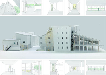 本提案では、外界とのつながりが希薄で都市が他人事になりやすい現代において、いま私がいる〈ここ〉を感じることと、時たま他者のいる〈そこ〉に対して〈ここ〉を感じること、この感覚に行き来によって、都市が誰かにとっての〈ここ〉のつながりで形成されていることを認識できるような建築を目指す。都内の公園と川に挟まれた住宅地に、敷地内外で相互に〈ここ〉〈そこ〉の関係性を見出しながら老人ホームやインキュベション施設を備えた複合用途型の集合住宅を提案する。周辺環境に基づいた様々な原理の縫い合わせによって構成される全体は、多重人格的でありながら、それぞれの〈ここ〉にいる感覚が連なることで、私と都市の中の誰かを意識の中でつなげることを期待する。