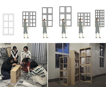 昨年 12月に実施制作を行い、窓の風景、空間の見え隠れ、視線の広がりを生む組み合わせを考え、研究室に設置しました。