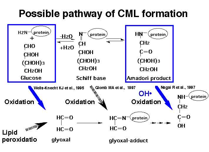 グルコースの自己酸化によってグリオキサールを介した経路、さらには(4) 脂質の過酸化反応によってグリオキサールを介した経路(左図)からも生成することが明らかとなっていますが、いずれの経路においてもCMLの生成には酸化反応が必須であることが明らかとなっており、CMLは特に生体における酸化反応のマーカーとして捉えられています。