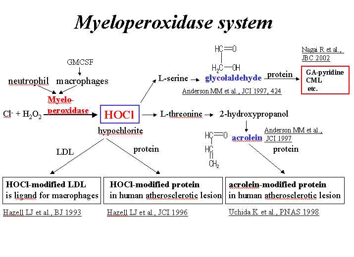 又、我々は、活性化されたリンパ球系細胞はミエロペルオキシダーゼの発現を介してGAを産生し、さらにGAはリジンと不可逆的に反応してAGE構造体であるGA-pyridineを生成することを報告しました(上図)(Nagai R et al., J Biol Chem 277, 48905-48912, 2002)。GA-pyridineは動脈硬化巣の泡沫化マクロファージ内に顕著に蓄積していることから、動脈硬化の進展にはGAによる蛋白の修飾も関与していると考えられます。従って、持続する高血糖状態は酸化ストレス、炎症、糖代謝の異常などから上述した反応性の高いアルデヒドの産生が亢進されることから、結果的に蛋白の修飾・変性が促進される状況であると言えるでしょう。なお、アルデヒドに存在するカルボニル基(C=O)が蛋白との反応部位であることから、アルデヒドによる生体蛋白の修飾は、カルボニルストレスとも言われています。