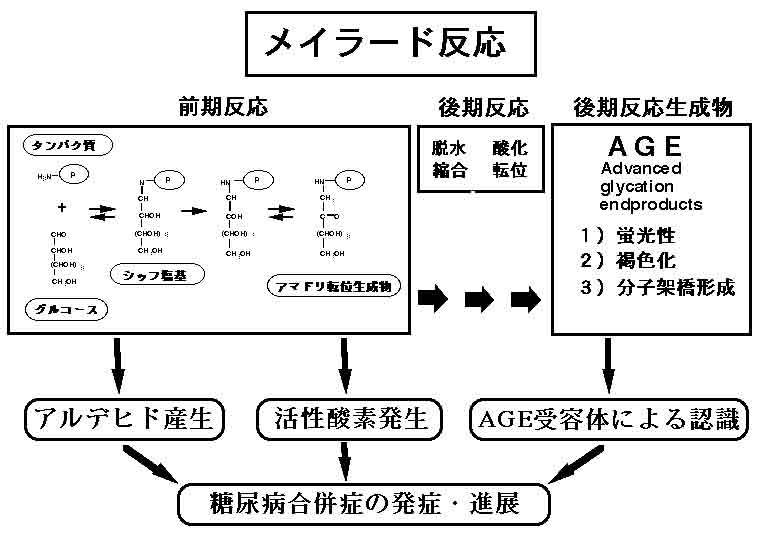 メイラード反応は還元糖のアルデヒド基とタンパク質のアミノ基との非酵素的な反応が初期段階であるため、グルコースに限らずアルデヒド基を有する物質であれば同様な反応が進行します(Nagai R et al., Diabetes 49, 1714-1723, 2000)。当初、生体におけるメイラード反応は主にグルコースと蛋白との反応であると考えられていましたが、最近ではグルコースの自己酸化、脂質の過酸化、細胞内の糖代謝などからグルコースに比較して高い反応性を示すグリオキサール、メチルグリオキサール、グリコールアルデヒド(GA)、3-デオキシグルコソン、グルコソン等のアルデヒドが蛋白のAGE化に深く関与していることが知られています。例えばメチルグリオキサールは細胞内で解糖系およびポリオール経路からも生成し、I型糖尿病患者の血中メチルグリオキサール含量は正常者の6倍、硝子体では2倍程度増加することが報告されています。