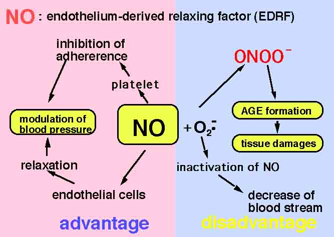 メイラード反応の亢進によるO2-の産生増加、(2) O2-によるNO分解の亢進、(3) NO産生の減少による血管拡張能の異常が引き起こされます(左図)。また、NOとO2-の反応によってより酸化能の強いペルオキシナイトライト(ONOO-)が生成しますが、ONOO-によって脂質の過酸化反応は更に促進され、さらに、我々はONOO-が単に蛋白を酸化するのみならず、前期中間体であるアマドリ転位物に作用するとAGE生成を促進することを明らかにしました(Nagai