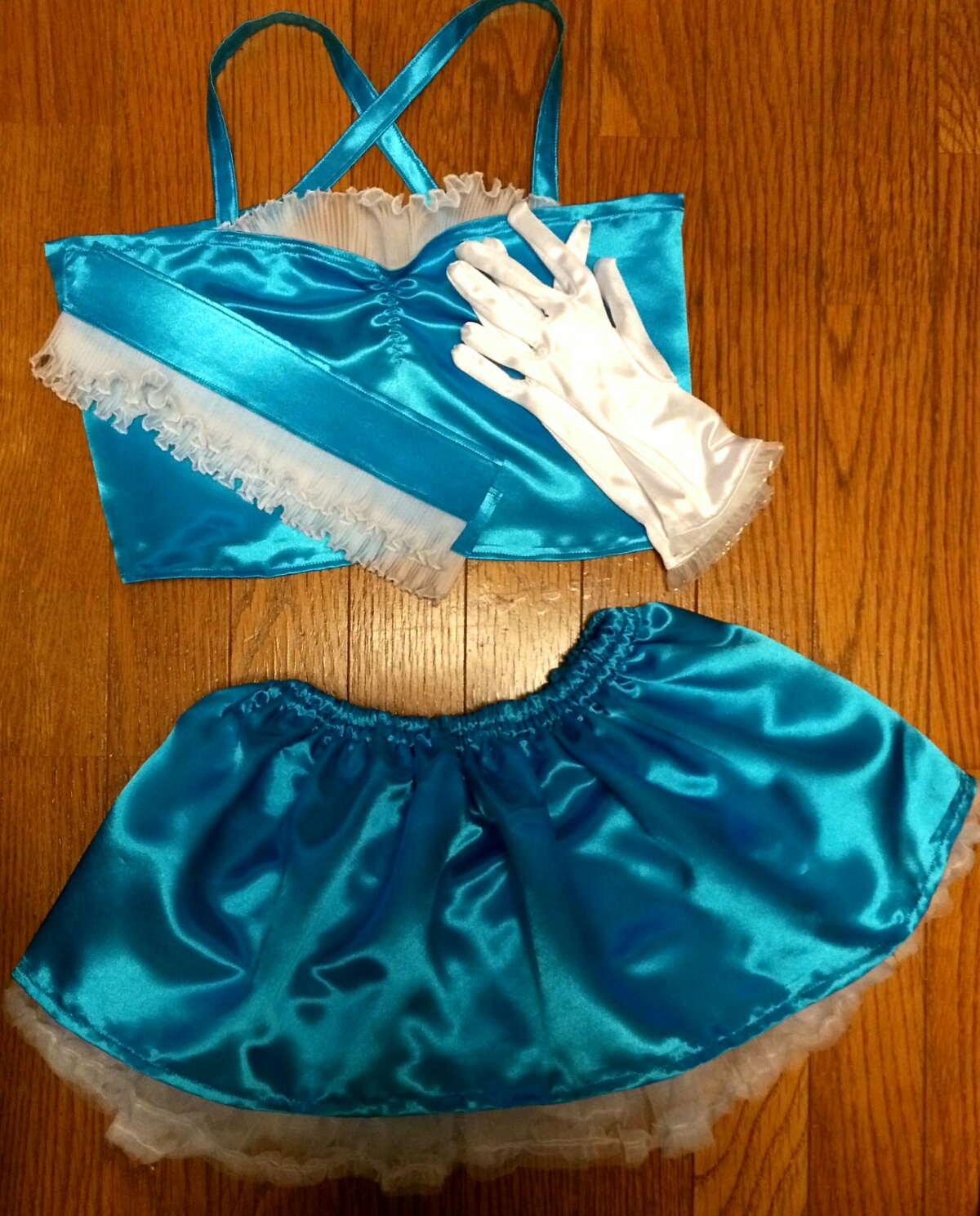 細かいところがまだなのですが、大体の原型はできたかなという感じです。手袋に付いてるレースは100均で購入しました。トップスは胸元にギャザーを入れて\/な形にしています。両腕につけるひらひら(?)も作りました!