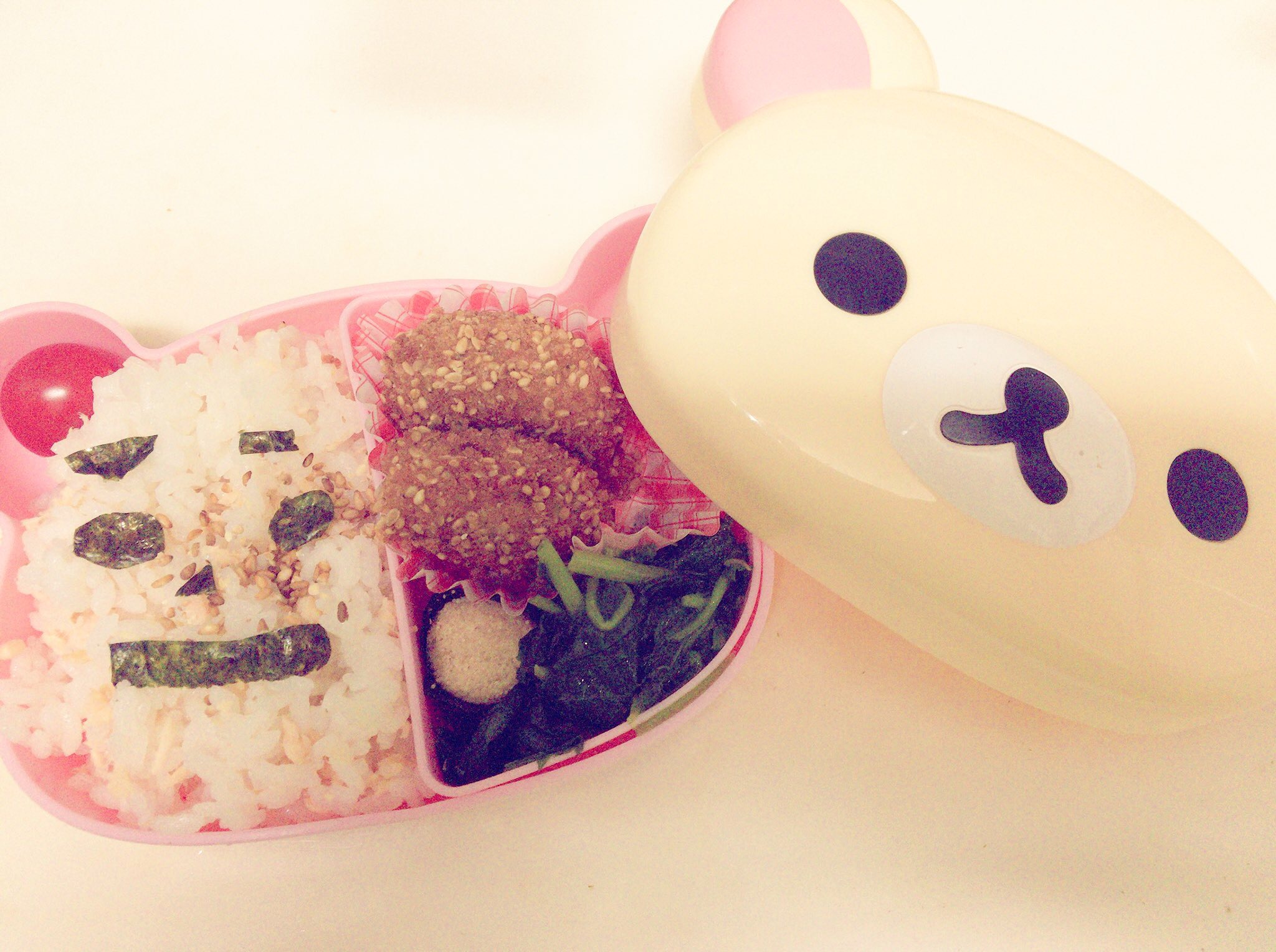高校時代に使っていたコリラックマのお弁当箱を取り出して、簡単に食材を詰めていきます。