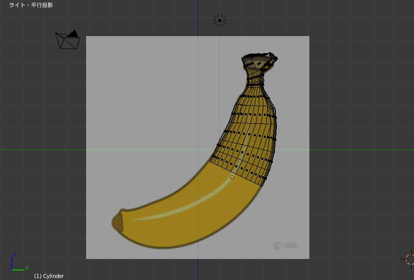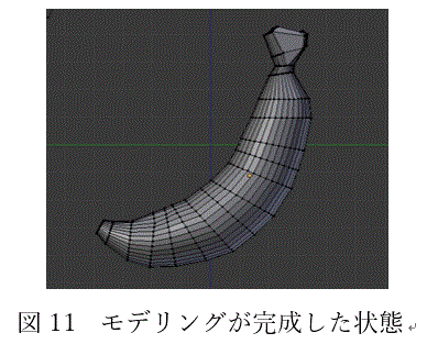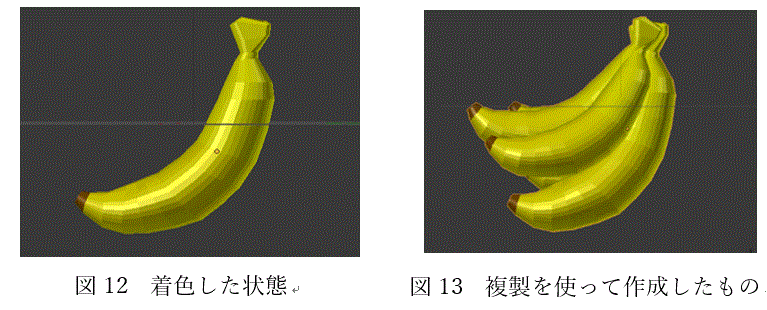具体的には図10のように奥に見本となる画像(下絵)を置き、それに合わせる様に被写体を変形します。それが終わった状態が図11です。下絵に似た形状の図形が図12では立体的に見えています。このように形が決まったら次は着色です。図13は図12を着色した物です。また、複製や角度の微調整を行うことでバナナの本数を5本に増やし、簡単に図13のようなモデルを作ることができます。