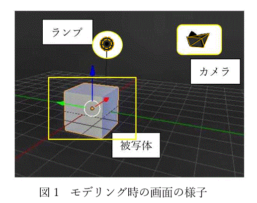 今回の実験ではWindows上でver.2.79bを使いました。ソフトを立ち上げると図1に示すように被写体、ランプ、カメラの3つの要素がスクリーン上に現れ、この画面上でモデリングを行います。モデリングでは画面上にある被写体の頂点や辺、面を変形する事ができます。透視投影の処理がリアルタイムで行われて、画面上にある被写体の頂点が決まり、立体を表現することができます。