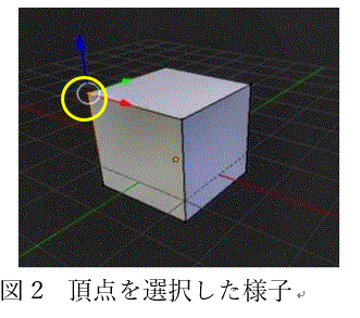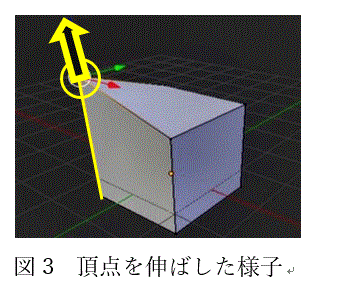本節ではまず、モデリングの手順として頂点・面・辺選択、押し出し、回転の3つの機能を使って被写体となる図2の立方体を変形する方法を説明します。図2では上の面の頂点のうち、丸で囲まれた頂点だけが選択されています。(以下、図中の丸印はソフト上での選択箇所を表します)この頂点を選択した状態で図3の矢印の示す進行に動かすと、被写体を変形させることができます。