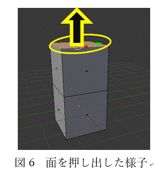 更に、押し出しの機能を使って面を押し出すと、押し出す前の形が残った状態で長さを変化させることができます。図6の図を見ると図5とは異なって図2の図形の上に更に図形ができていることが分かります。1本の辺は、途中で曲げることができません。そのため図7のように図5の面を選択して矢印の進行方向に動かしたものや、図8のように図6の面を選択して矢印の進行方向に動かしたもののように押し出しを使うと複雑な図形も表現できるためモデリングの幅が広がります。