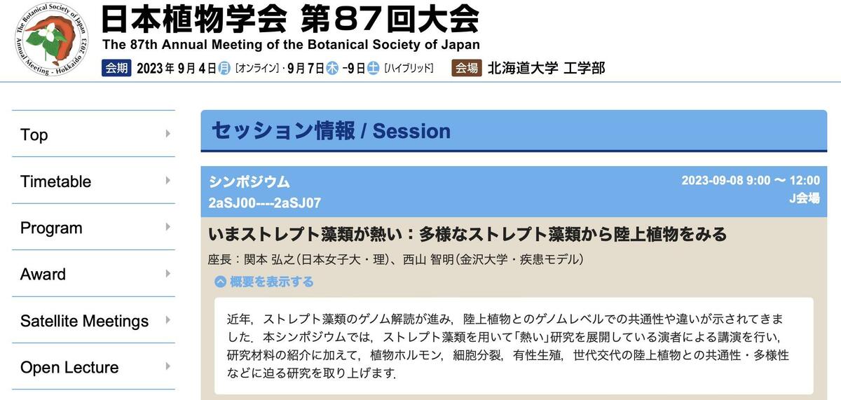 連投ですみません。日本植物学会にて、シンポジウム「今、ストレプト藻類が熱い」を開催し、無事終了しました。多くの聴衆の参加とともに、まさにホットな話題提供をしていただきました。エボデボ関係の研究を考える上で、何があって、またはなくて、何がどの段階で獲得され、さらにいつ陸上植物と同様の機能を獲得したのか、とても気になる講演をしていただきました。