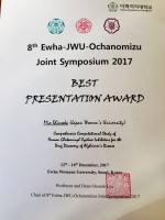 Congratulations! Mio Shinoda who is a graduate student in our lab has got the presentation award in 8th Ewha-JWU-Ochanomizu Joint Symposium in Seoul. We are going to accelerate the research.